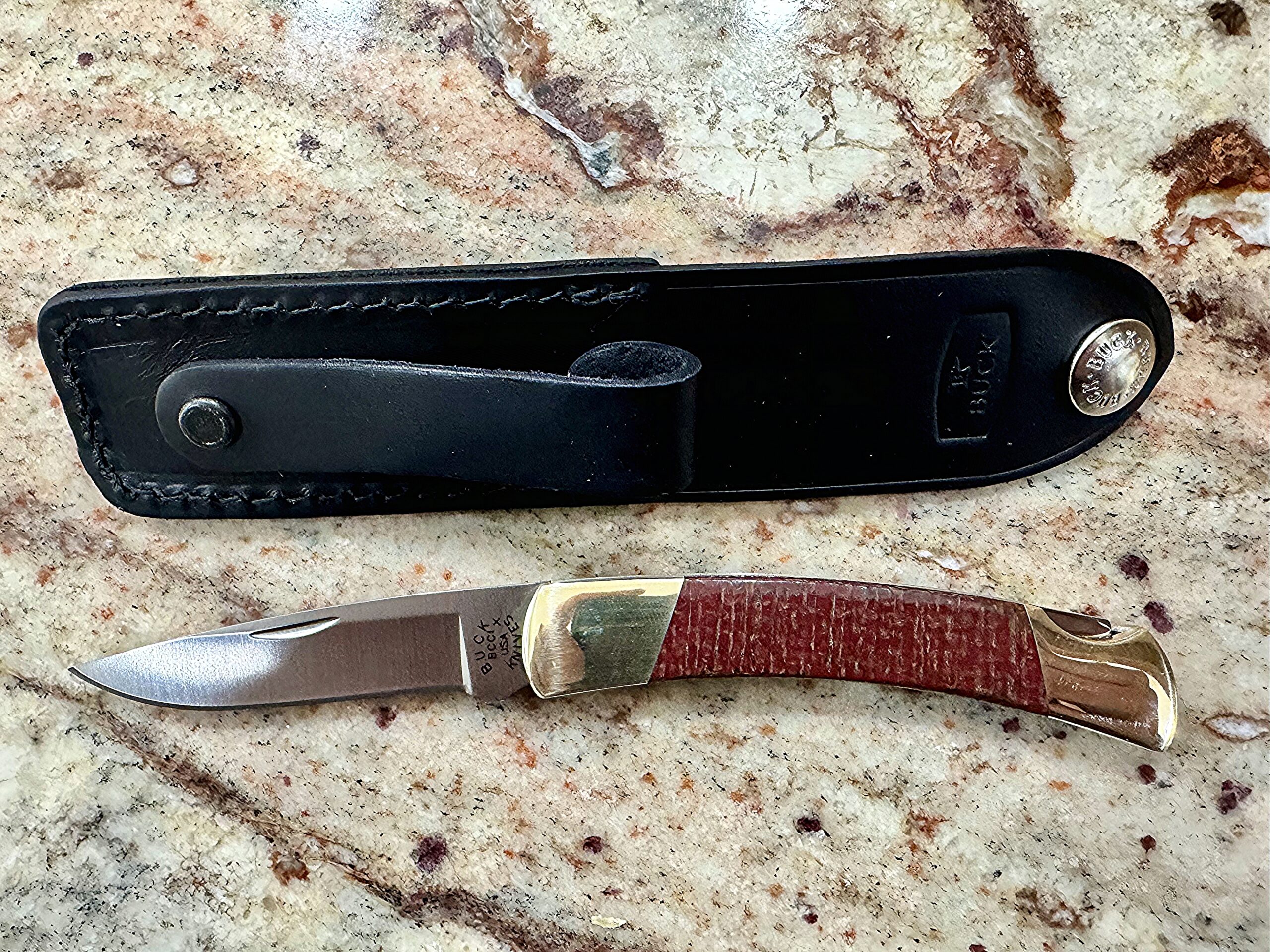 - Sheath: Black leather, snap-button closure, belt loop, embossed with Buck logo