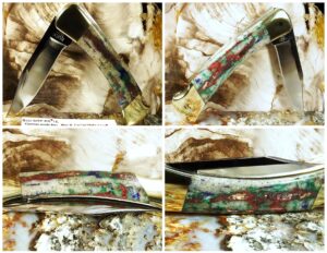 This ore is technically one of the most complex stones I have worked with. Copper has a MOH’s hardness of about 3, Molybdenum about 5.5 and the sugary quartz about 7.0. The metals cut a lot faster than the quartz and this impacts the spine area the most with both the fit line and roll over from the spine to the scale flat. This ore has a lot of texture in mostly the quartz areas as this ore is sugary. I priced these by mostly my preference with the price varying from the worst texture and fit lines to the ones with the least texture, best lines and most native metal showing. The photos are very accurate as to the texture, spine fit line to the bolster and in the roll over from the spine to the flat.