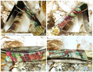 This ore is technically one of the most complex stones I have worked with. Copper has a MOH’s hardness of about 3, Molybdenum about 5.5 and the sugary quartz about 7.0. The metals cut a lot faster than the quartz and this impacts the spine area the most with both the fit line and roll over from the spine to the scale flat. This ore has a lot of texture in mostly the quartz areas as this ore is sugary. I priced these by mostly my preference with the price varying from the worst texture and fit lines to the ones with the least texture, best lines and most native metal showing. The photos are very accurate as to the texture, spine fit line to the bolster and in the roll over from the spine to the flat.