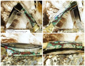 This ore is technically one of the most complex stones I have worked with. Copper has a MOH’s hardness of about 3, Molybdenum about 5.5 and the sugary quartz about 7.0. The metals cut a lot faster than the quartz and this impacts the spine area the most with both the fit line and roll over from the spine to the scale flat. This ore has a lot of texture in mostly the quartz areas as this ore is sugary. I priced these by mostly my preference with the price varying from the worst texture and fit lines to the ones with the least texture, best lines and most native metal showing. The photos are very accurate as to the texture, spine fit line to the bolster and in the roll over from the spine to the flat.